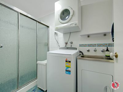 Downstairs also features a laundry with a shower and a separate toilet — ideal for rinsing off the sand after a swim.